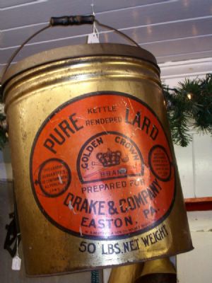 Lard CanGolden Crown red label fifty pound lard can with beautiful red and gold graphics. Can is in very used condition with quite a few scuffs but is still a beautiful and bright can for display or for use as a container.